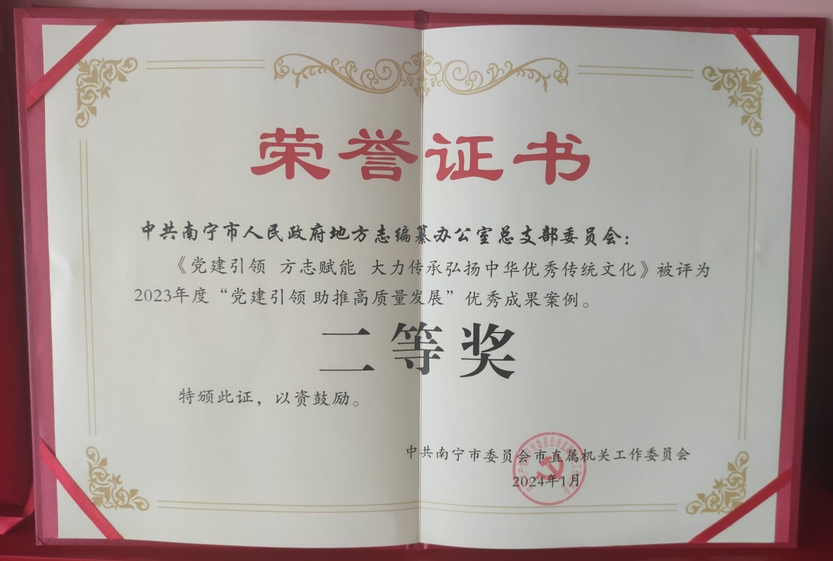 • 2024年1月,《党建引领 方志赋能 大力传承弘扬中华优秀传统文化》被评委2023年度“党建引领 助推高质量发展”优秀成果案例二等奖